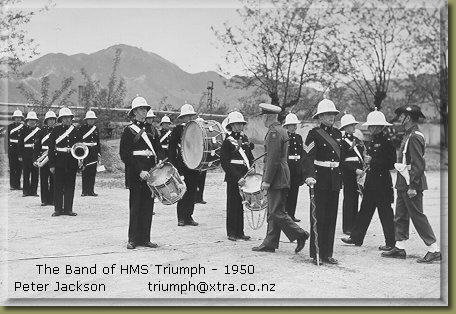 Rich I have dug up a few photo's of bands way back which I thought might be interesting. The first one is the HMS Pembroke band performing at Hawkehurst in Kent in 1951. The occasion was The Annual Floral Festival. I am in the band and I am pretty sure it was from Chatham but we may have gone from Deal. If anyone knows any of the good citizens of Hawkehurst I have lovely photo taken at the same time of The Floral Queen and her attendants seated on a float and would be happy to send them a copy. I wonder if any of the band are still around. Another couple of photo's which might interest some ex-members of the band of HMS Triumph. It was taken at Kure in Japan on the Anzac day parade hence the Australian General. At that time the Australians were the occupying force in the area. Cocoa was worth its weight in gold and I used to smuggle tins of it concealed within my bassoon case which was the old design - square in shape with the lid on the end. Anyone remember? Others used to borrow it for the same purpose.